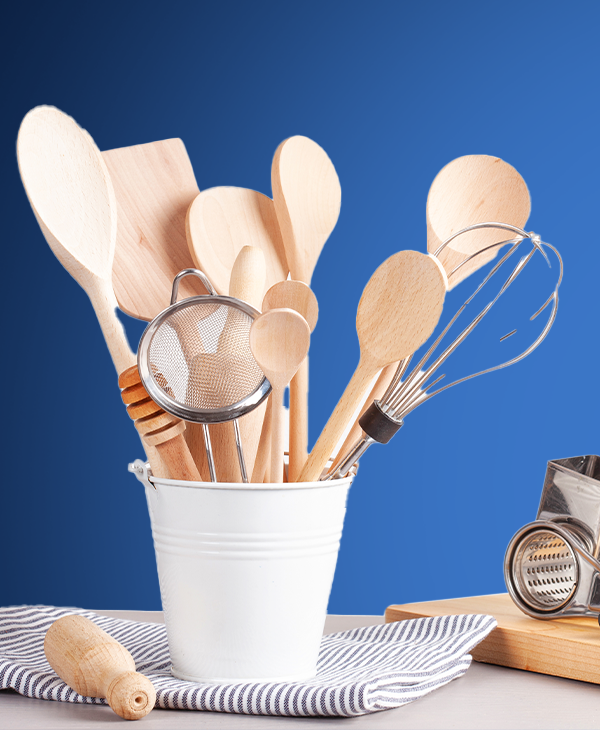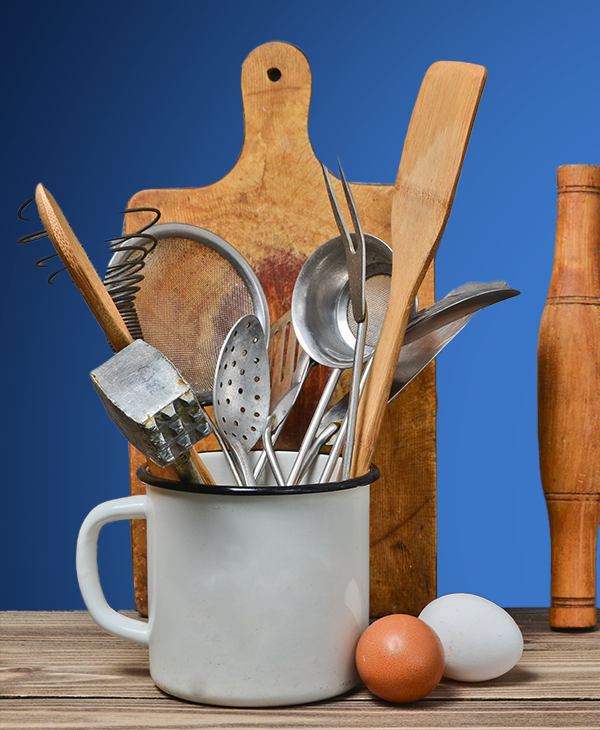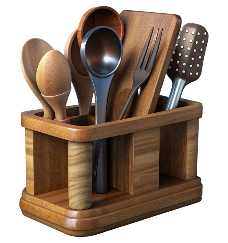 Utensils: A large collection of glass, pottery, and plastic utensils. Knives: High quality chef knives, paring knives, and decorative knives. Spoons: Wooden, metal, and silicone spoons of various sizes and shapes.